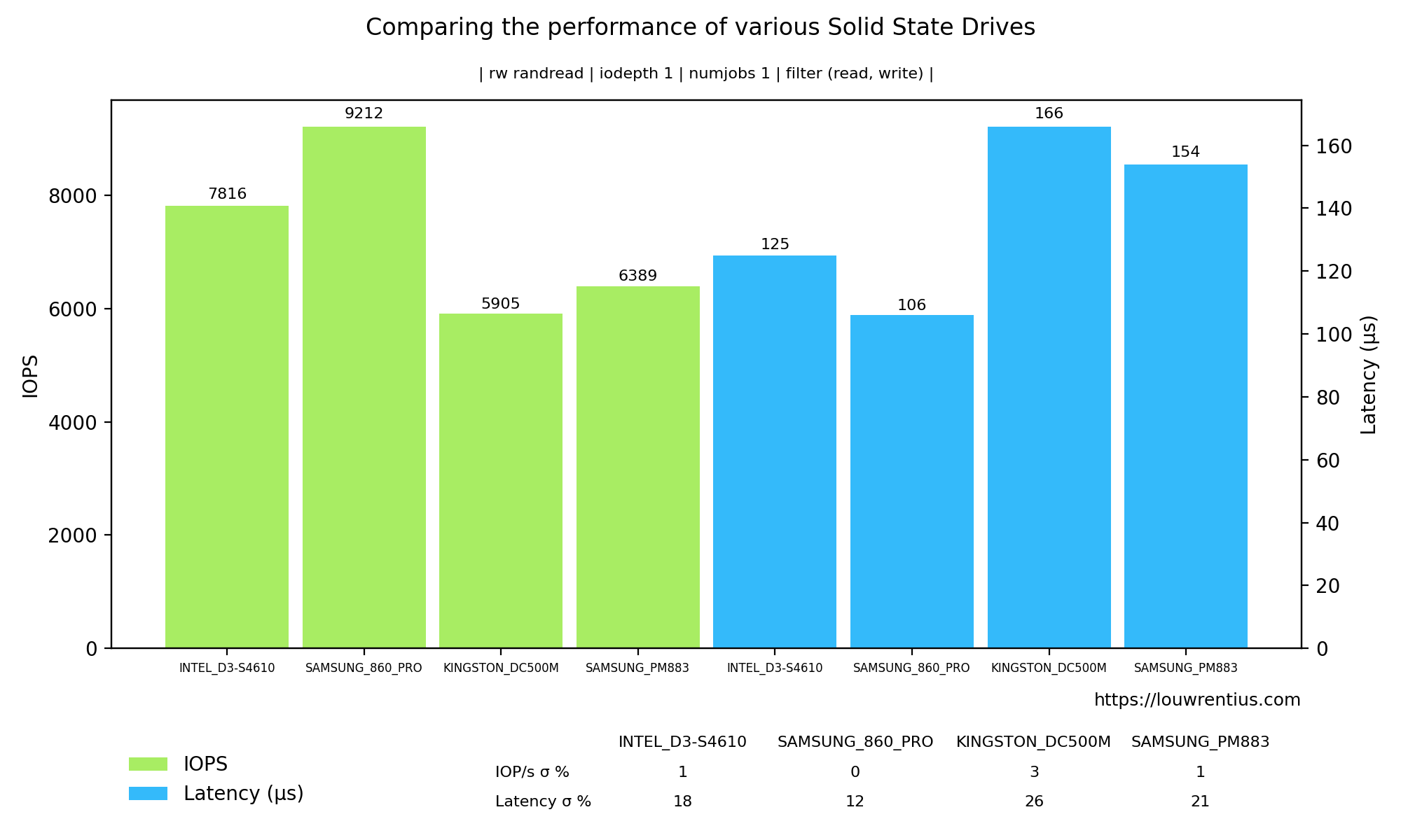 fio-plot -i INTEL_D3-S4610 SAMSUNG_860_PRO KINGSTON_DC500M SAMSUNG_PM883 --source "https://louwrentius.com" -T "Comparing the performance of various Solid State Drives" -C -r randread --xlabel-parent 0 --group-bars