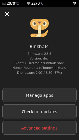 After installation, Rinkhals provides a touch UI accessible from the printer screen when you tap the Settings icon, then tap Rinkhals.
