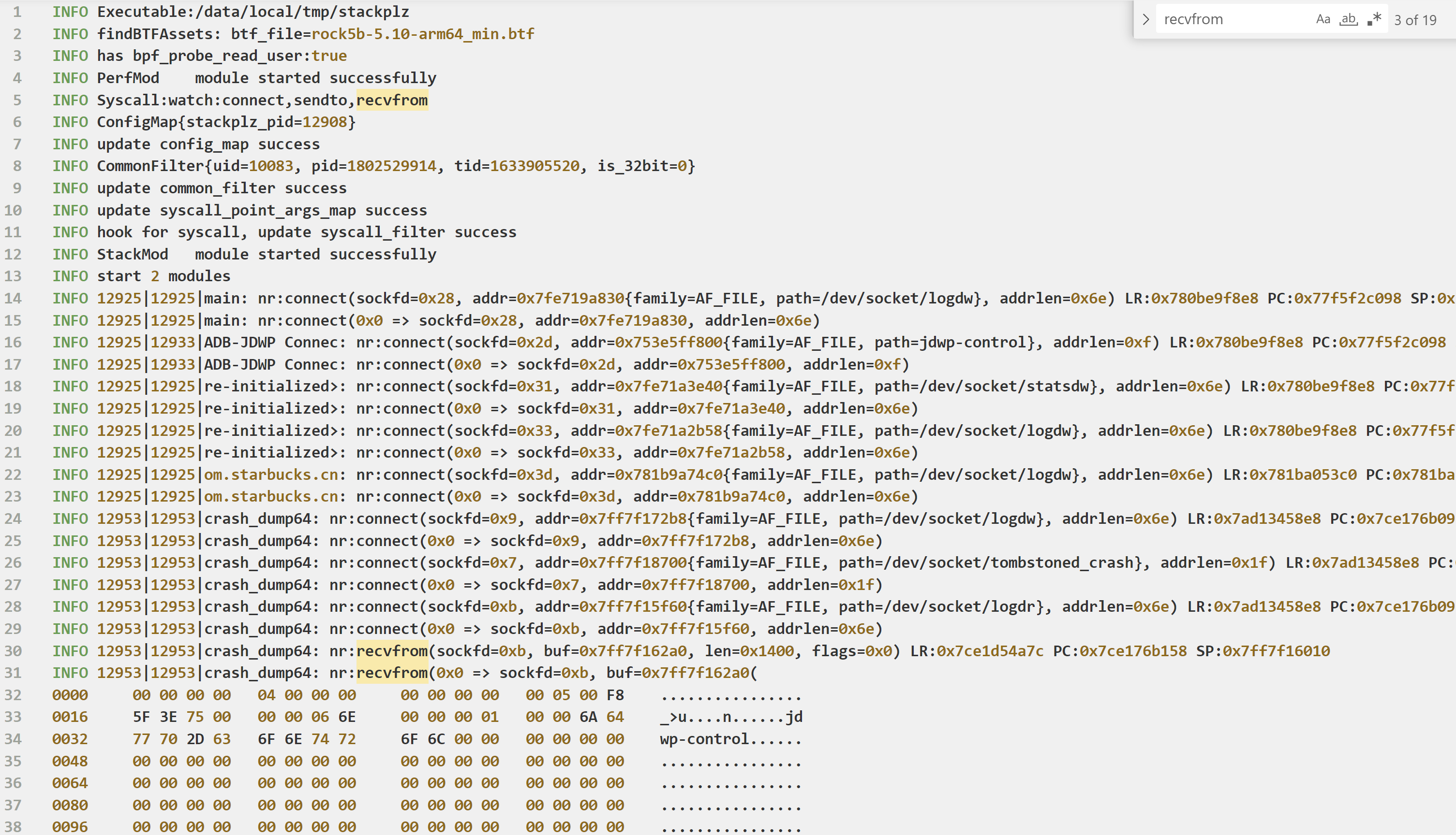 ./stackplz -n com.starbucks.cn --syscall connect,sendto,recvfrom -o tmp.log --dumphex自定义syscall参数类型