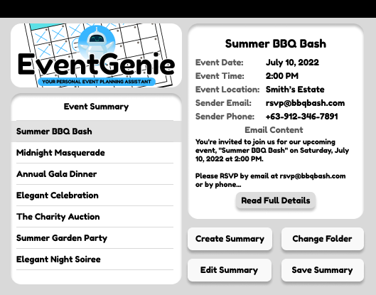 EventGenie is a software that acts as an event planning assistant, helping users to sort and organize events. It extracts information from invitations stored in a specified folder and compiles it into a summary. The software uses regular expressions to identify patterns in the text and returns important details such as the event name, date and time, location, sender's email, and phone number. The summary can be saved as a '.txt' file, '.csv' file or added directly to the Outlook calendar as an appointment using the 'win32com.client' module. With EventGenie, event planning becomes easier and more efficient as it sorts the events from earliest to latest. This makes it easy for users to prioritize and stay on top of their schedule.