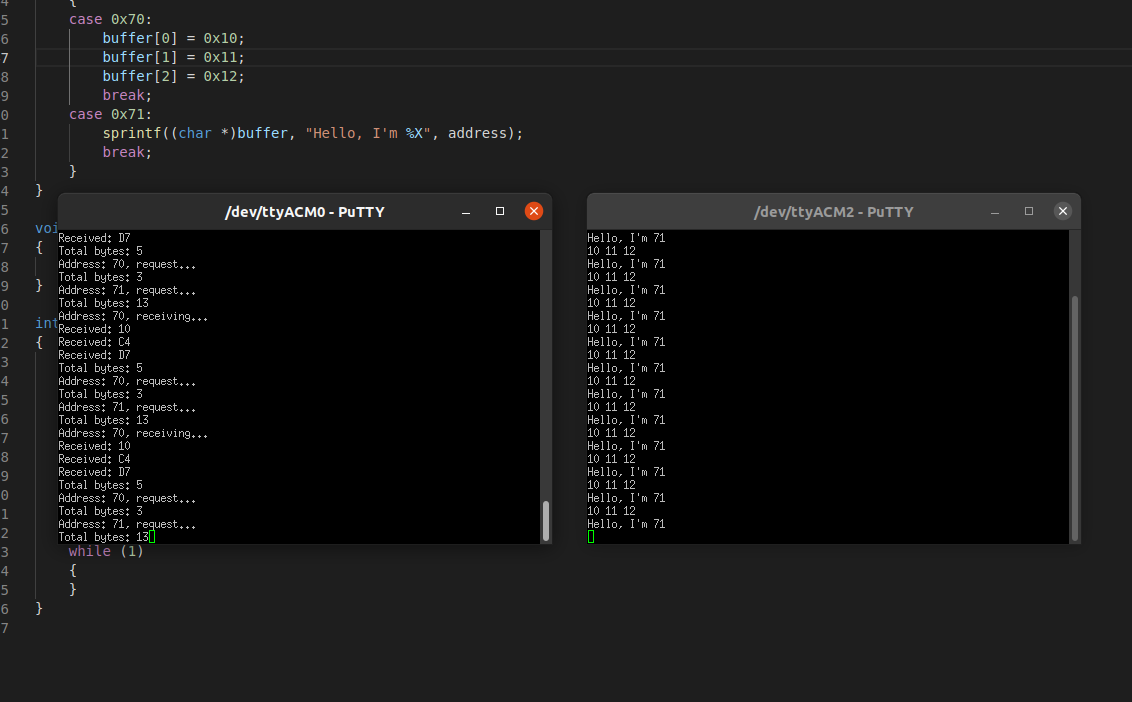 RP2040 as I2C slave (left), receving and sending data to multiple I2C addresses sent from I2C master (right)