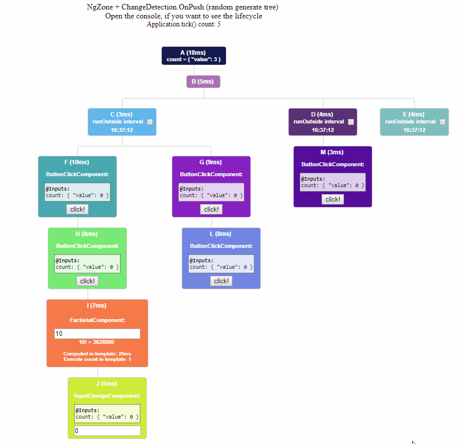 This project shows you how the component tree in Angular is updated. The time shown on the component nodes in the tree is the interval between ngDoCheck and ngAfterViewChecked.