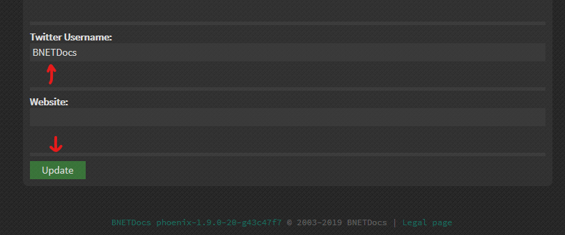 Logged in as the BNETDocs user and tried to update the Twitter handle, but got internal error.