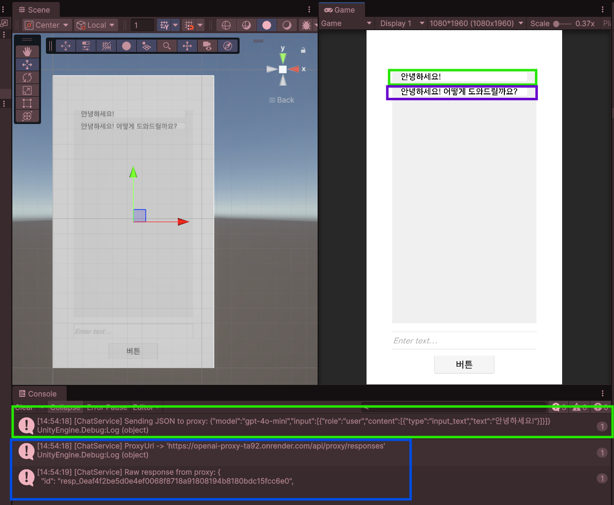 - Unity UI를 통한 ChatGPT 스타일의 실시간 대화 인터페이스 구현 성공