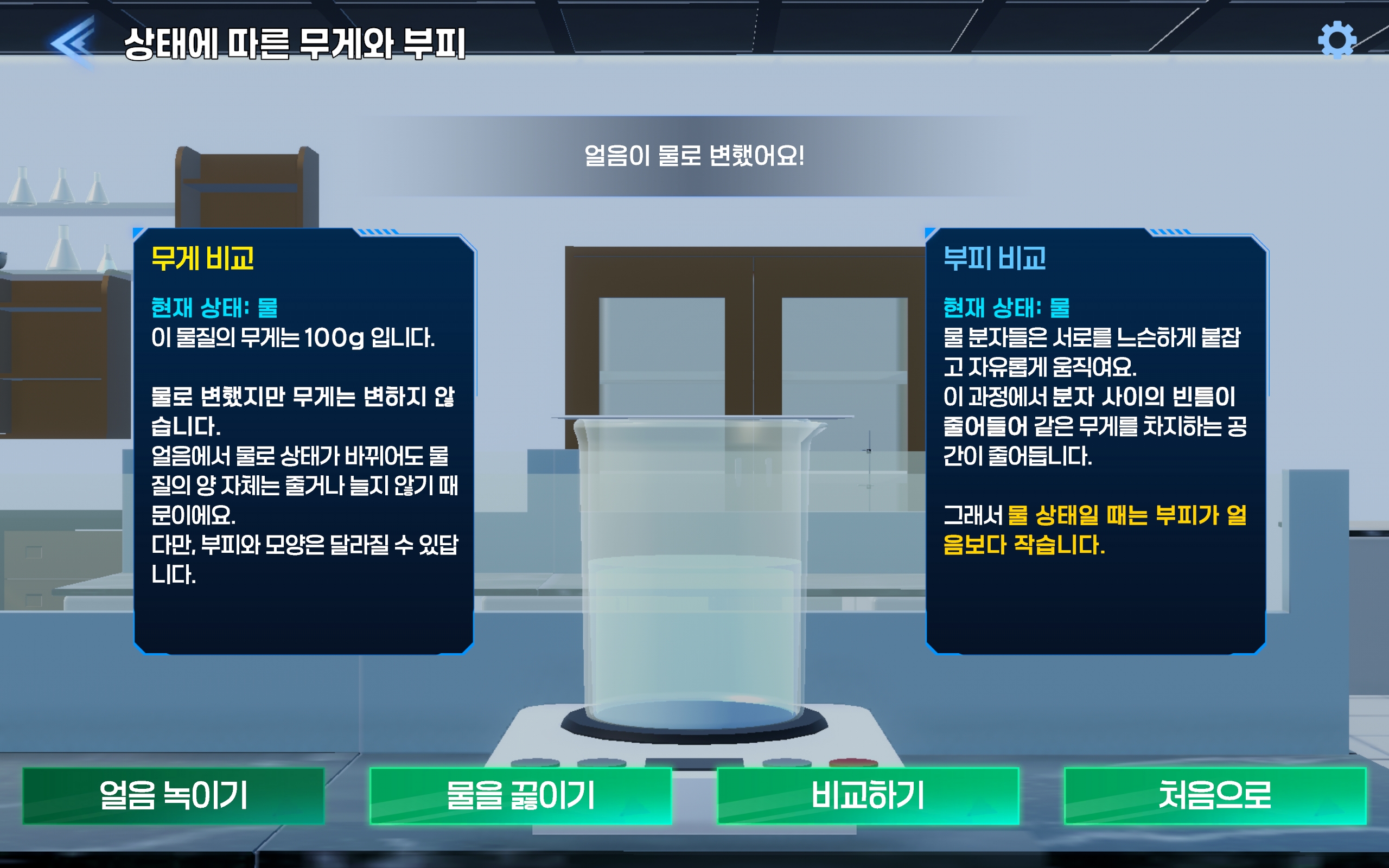 무게/부피 비교 팝업을 통해 얼음/물/수증기 비교 |