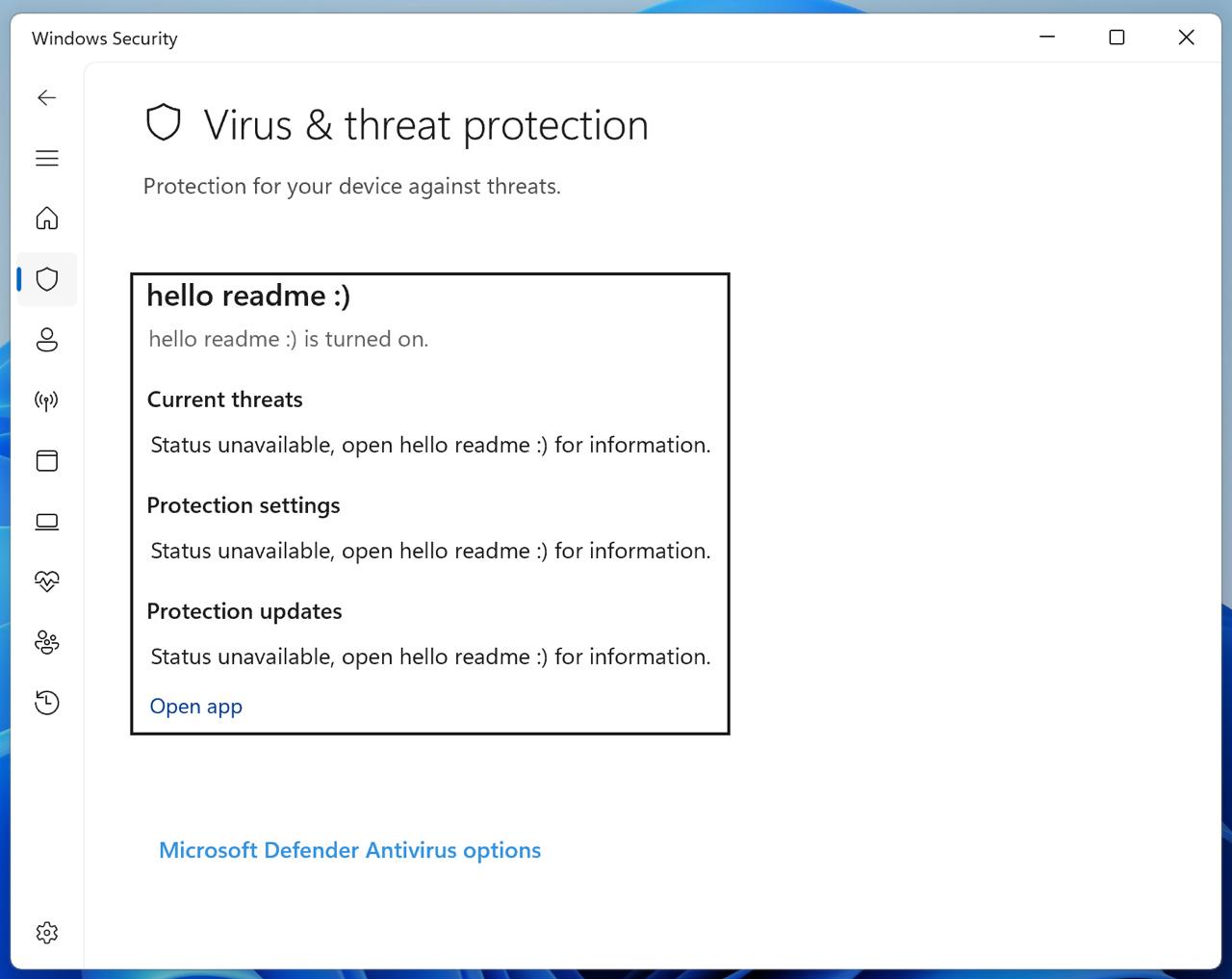 The initial implementation of no-defender used thirdparty code provided by other AVs to register itself in the WSC, while defendnot interacts with WSC directly.