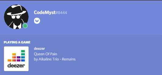 deezcord Show your deezer status in Discord using Rich Presence. NOTE: Because of the deezer API it can only display the last song in your history, not the currently played one.