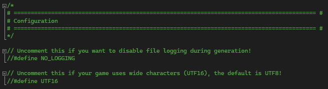 In the Configuration.hpp file there are two defines, one is NO_LOGGING which disables writing to a log file, and another define called UTF16. If your game is using wide characters you will need to uncomment this define out, if not UTF8 will be used by default.