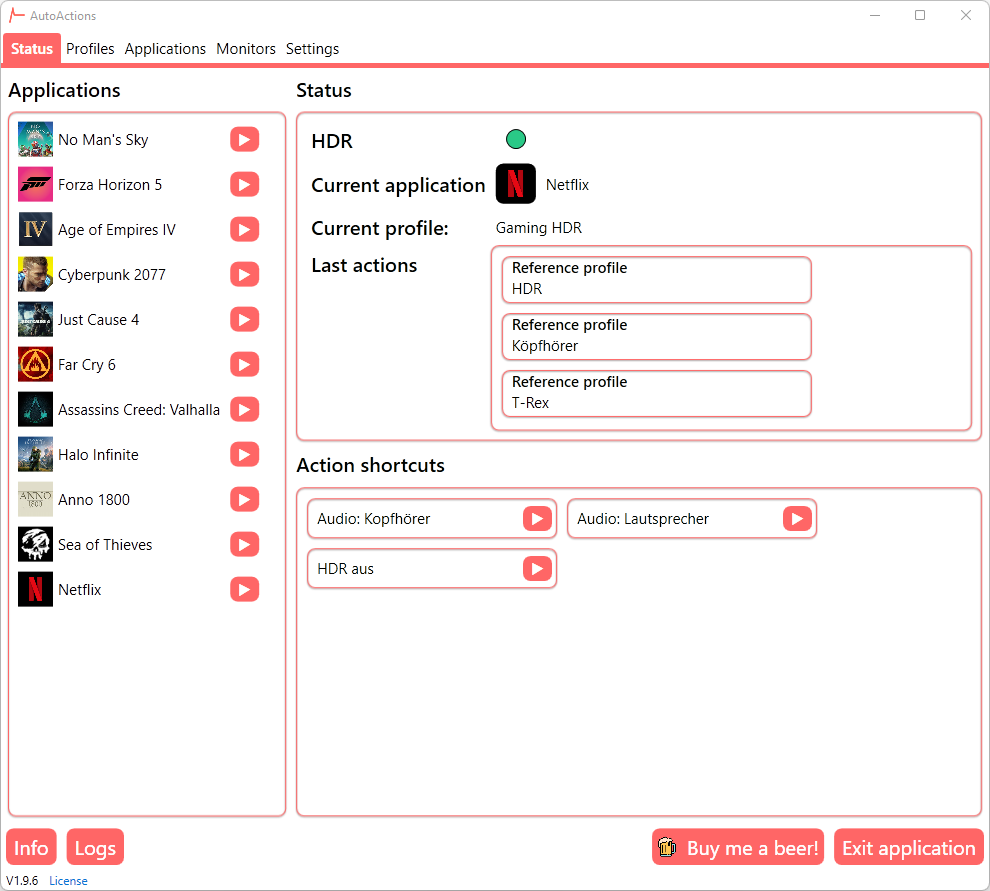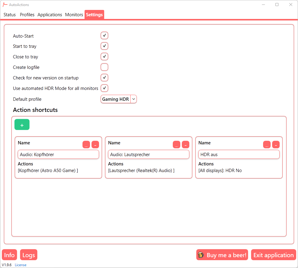With AutoActions, you can created profiles which included several actions. You can change display settings, set default audio devices or launch any other script or program. Once you have added an application and assigned a profile to it, AutoActions will monitor this application and will run the actions based on the assigned profile.