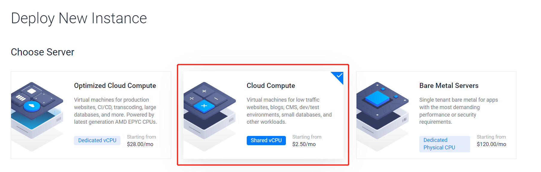 第四步:选择套餐,当然ss不需要配置太高的服务器,最低配置5美金一个月的就可以了,反正我每次看2.5美金都是卖光的,如果你能看到那赶紧选啊,千年一遇。