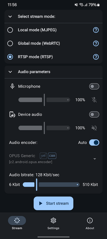 ScreenStream offers three stream modes: Global mode (WebRTC) (in Google Play Store version only), Local mode (MJPEG) and RTSP mode. All modes aim to stream the Android device screen and audio but function differently. They are independent of each other, with unique functionalities, restrictions, and customization options.