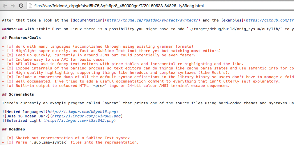 syncatprints a highlighted file to the terminal using 24-bit colour ANSI escape codes. It demonstrates a simple file highlighting workflow.synhtmlprints an HTML file that will display the highlighted code. Demonstrates how syntect could be used by web servers and static site generators.synstatscollects a bunch of statistics about the code in a folder. Includes basic things like line count but also fancier things like number of functions. Demonstrates howsyntectcan be used for code analysis as well as highlighting, as well as how to use the APIs to parse out the semantic tokenization.faiyelsis a little code minimap visualizer I wrote that usessyntectfor highlighting.parsyncatis likesyncat, but accepts multiple files and highlights them in parallel. It demonstrates how to usesyntectfrom multiple threads.