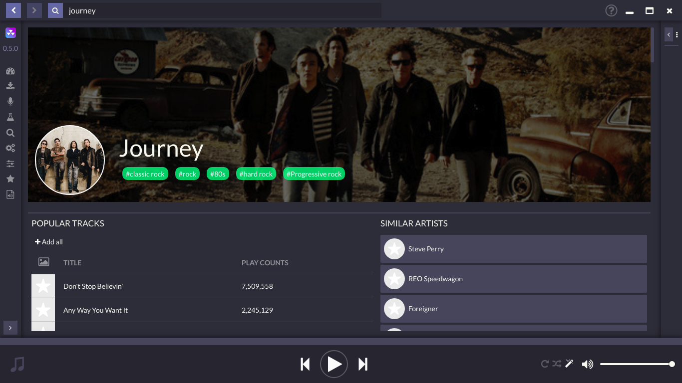 - Searching for albums (powered by Last.fm and Discogs), album view, automatic song lookup based on artist and track name (in progress, can be dodgy sometimes)