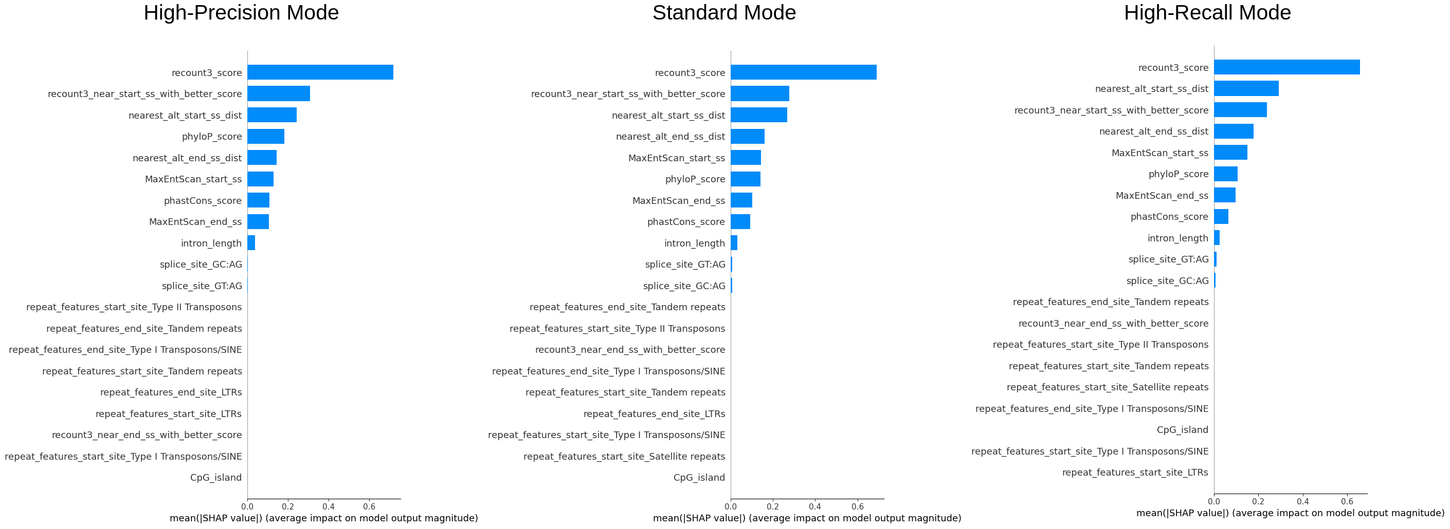 We can see that recount3 score is the most important feature and from the first plot we can see that the model definitely favours entries with high recount3 score. One interesting finding is that phyloP or the phastCon score is also an important feature, as it was not incorporated in the original filters used by the annotation team, this could also be considered.