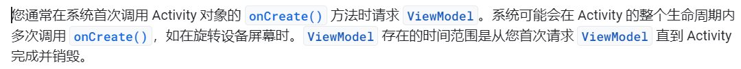 }也就是说ViewModel的生命周期依托于ViewModelProvider传入的lifecycle参数,而lifecycle接口又由Activity,Fragment等实现,故ViewModel会和视图组件间接性的形成联系。并且在lifecycle组件第一次调用onCreate后初始化VIewModel(在之后的配置变化如屏幕旋转等都不会再次创建ViewModel),等到lifecycle组件调用了onDestroy方法,并且彻底凉透了,ViewModel才会调用onCleared释放内存。