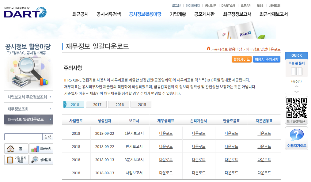 금감원 전자공시(DART)의 공시정보활용마당의 제무정보를 사용하기 편리하게 가공한 데이터셋 입니다.
