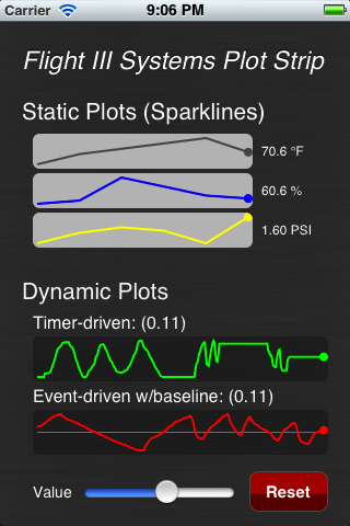 The resulting control can be used as a dynamic plot line as well as a more static "sparkline" type of widget. When linked to a UILabel control, it will update the label with the most recent value in a customizable format.