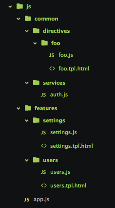 For common stuff, we created a common folder where we can put all our services and directives. Notice how I put the foo directive template inside the same folder.