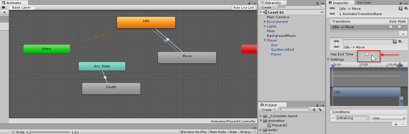 Solution found here: http://answers.unity3d.com/questions/1037533/survival-shooter-tutorial-player-animation-not-pla.html.
