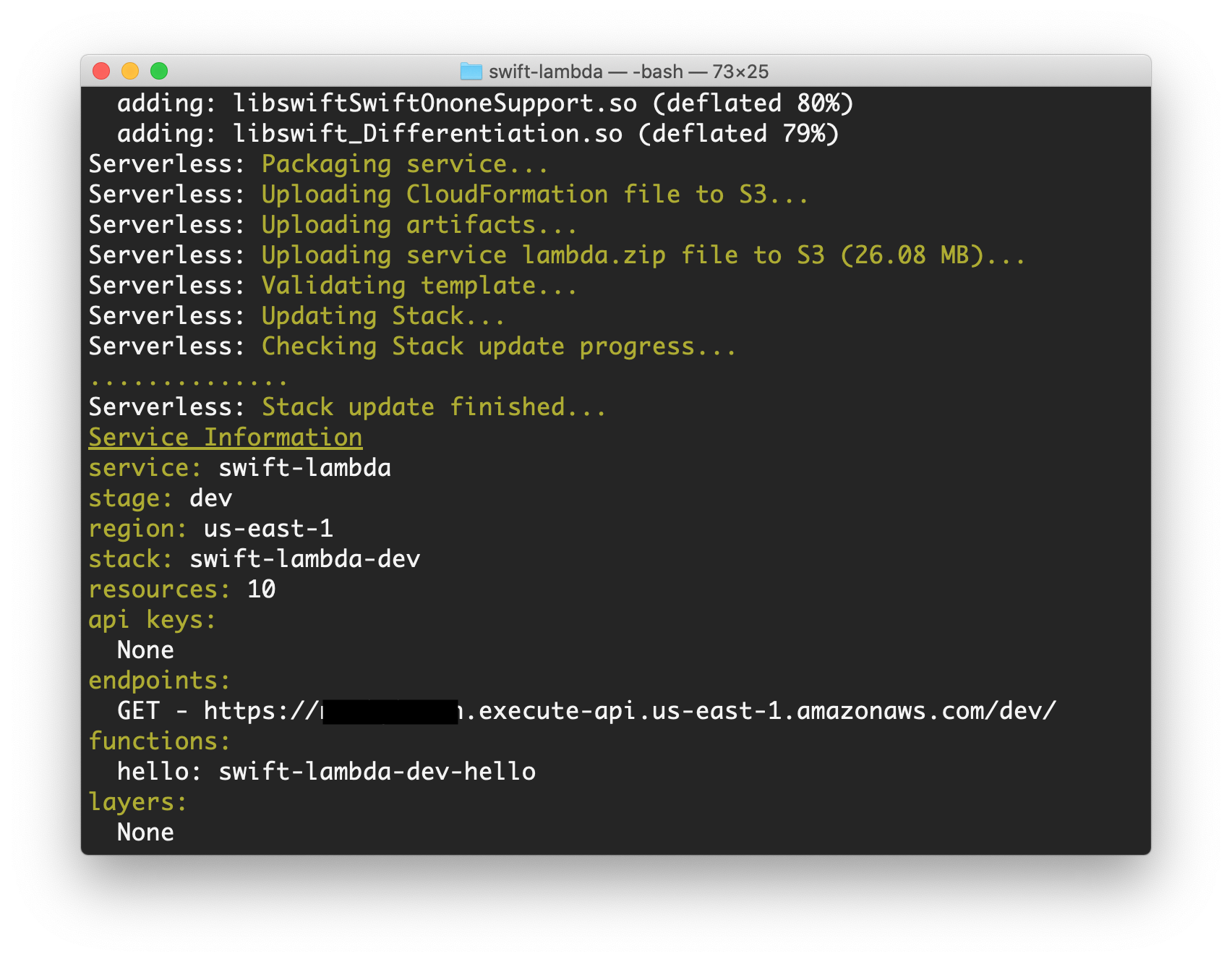 This project is a starting point for writing an HTTP service in Swift. It contains configuration files and scripts to fully automate deploying to AWS in a matter of seconds using the Serverless Framework. It is based on samples and documentation from swift-server/swift-aws-lambda-runtime