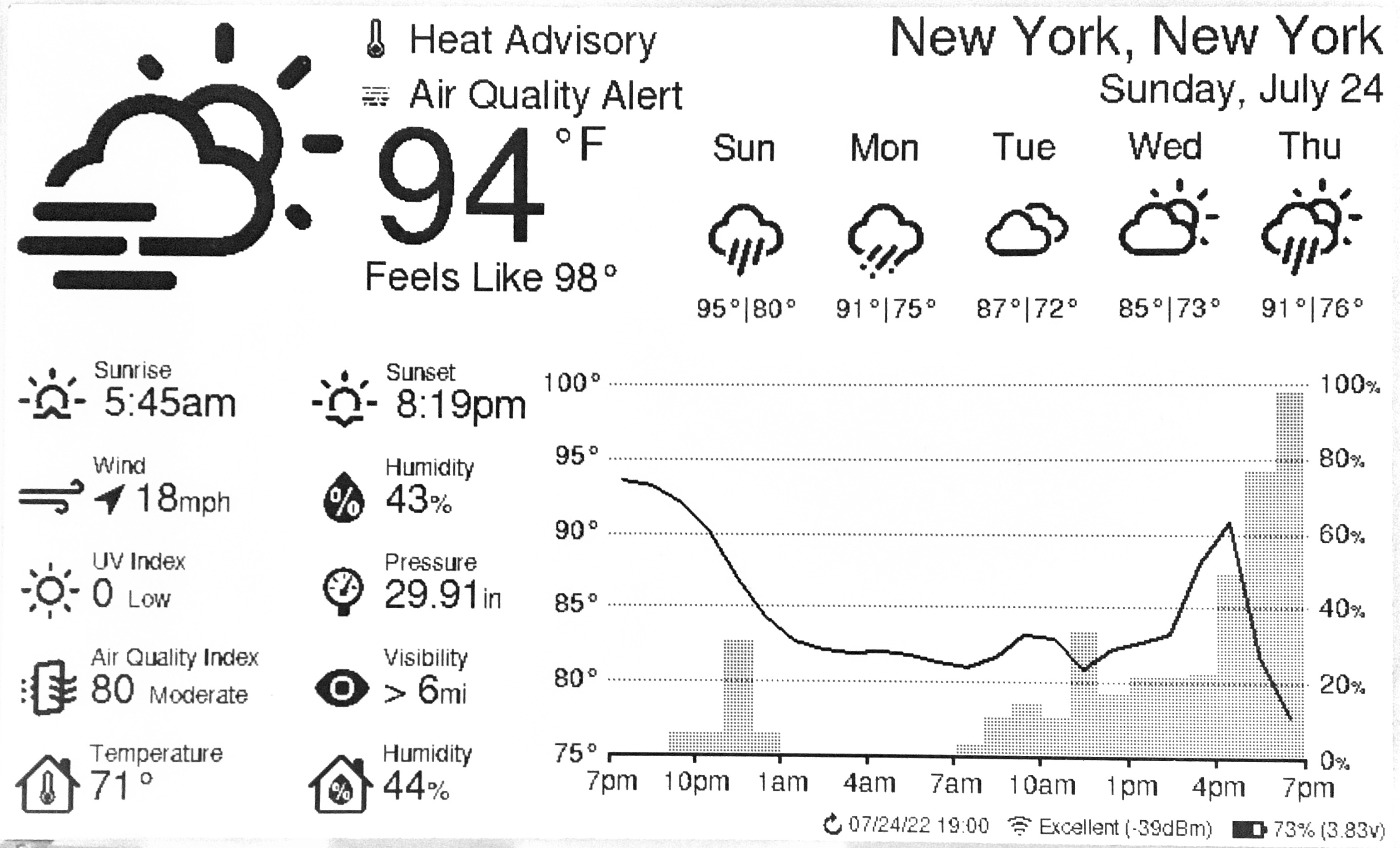 This is a weather display powered by a wifi-enabled ESP32 microcontroller and a 7.5in E-Paper (aka E-ink) display. Current and forecasted weather data is obtained from the OpenWeatherMap API. A sensor provides the display with accurate indoor temperature and humidity.