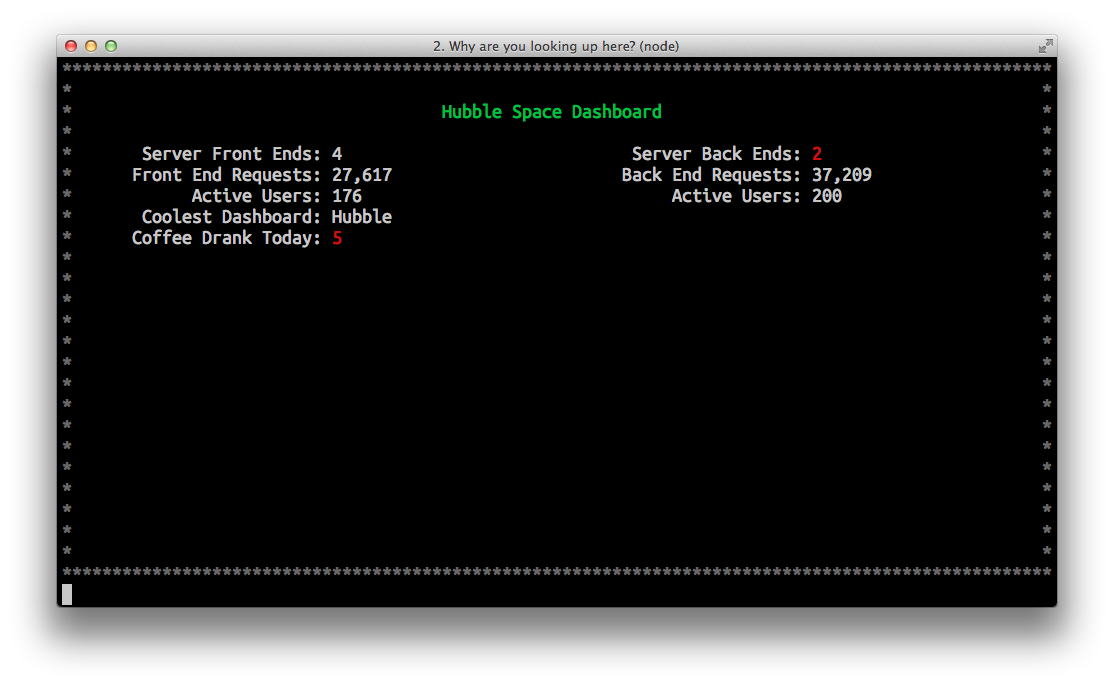 Hubble is a dashboard that displays in a terminal with any data you provide via http. It also allows you to setup thresholds if a number goes above/under a certain value. You can have any webhooks, programs, workers, scripts, etc just send an http post request (or setup an api endpoint to poll) and it will get placed on the dashboard. Be creative!!