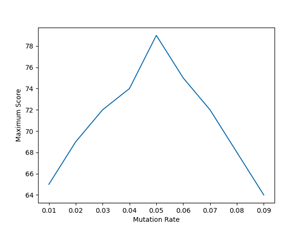 As it can be seen that the maximum score that we have achieved was at mutation rate 0.05. As we have increased mutation rate from 0.05 the maximum score starts decreasing