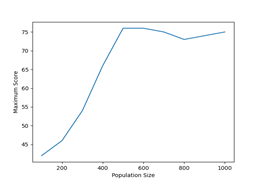 The results show that we have achieved a maximum score of 76 when population size was set to 500. But after 500 the score remains almost static. Remember that for each generation of 500 1000 offsprings are created and from that 1000 offsprings 500 are selected to take part in the next generation.
