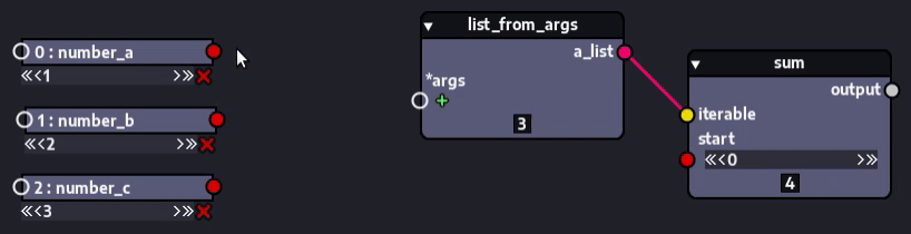 Nodezator offers the ability to define nodes with variable-kind parameters, that is, *args and **kwargs, parameters that can receive as arguments as needed. All you need is for the callabe you create/provide to have such parameters (of course, you can name these parameters whatever you want, as long as they have the * or ** to indicate their kind).