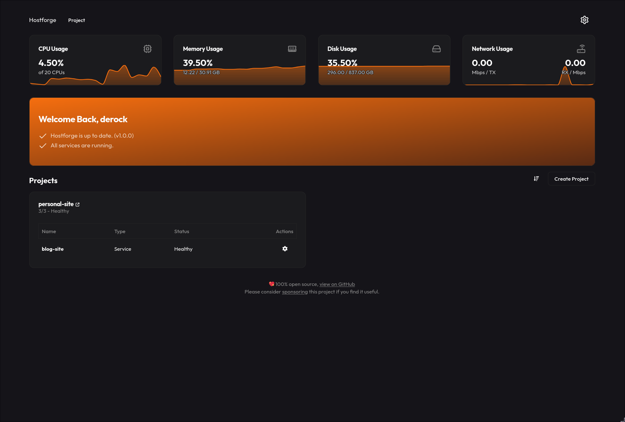 - Secure - Hostforge is built with security in mind. All projects use their own network and are isolated from each other.