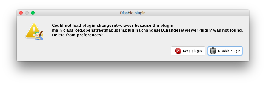 - W: Disable plugin - <html>Could not load plugin changeset-viewer because the plugin<br>main class 'org.openstreetmap.josm.plugins.changeset.ChangesetViewerPlugin' was not found.<br>Delete from preferences?</html>