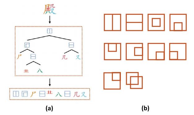 RadicalMaker可以随机生成一串偏旁部首序列,并组合成新字,即字典中不存在的字。一个汉字可以解析成一颗树,例如 ‘㐻:⿰ 亻 内’表示‘㐻’由左右结构组成,包含左侧的‘亻’与右侧的‘内’,偏旁部首序列即为树的前序表示。