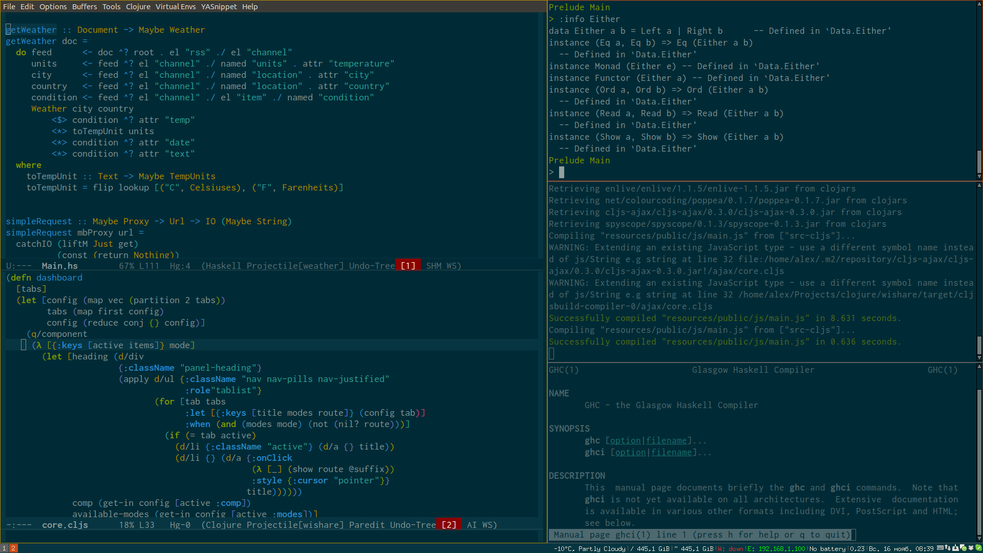 i3 помогает удобно располагать окна. Обычно, это одно основное окно и несколько сателлитов поменьше, которые укладываются в столбик/вкладки в правой трети экрана. Ну а Emacs редактор/IDE для всех языков, на которых я пишу. А цвета у меня почти везде solarized.