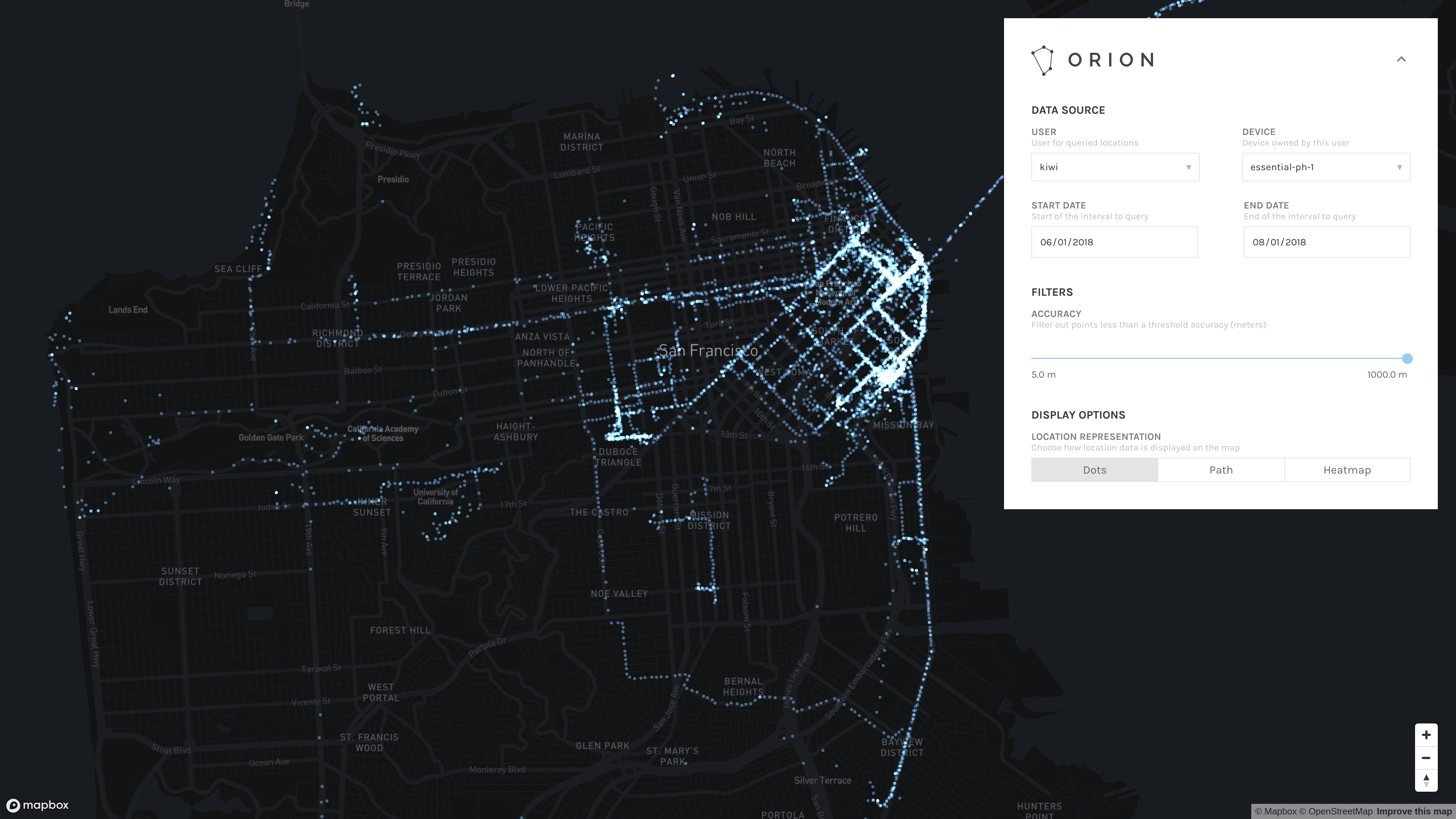 The Orion platform consists of orion-server and orion-web. The former is a server-side application for recording location events reported by OwnTracks mobile clients. The latter is a web application for visualizing data collected by orion-server.