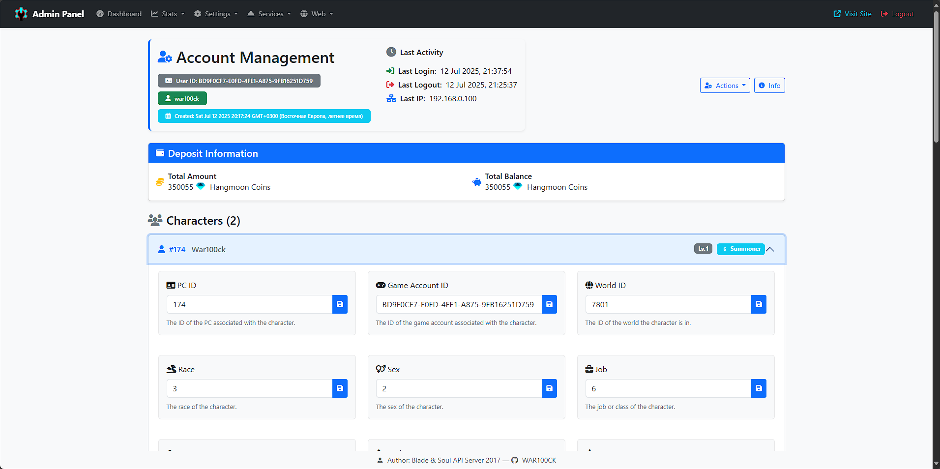 - Profile Management: Full support for viewing and updating user profiles, including character data and account information.