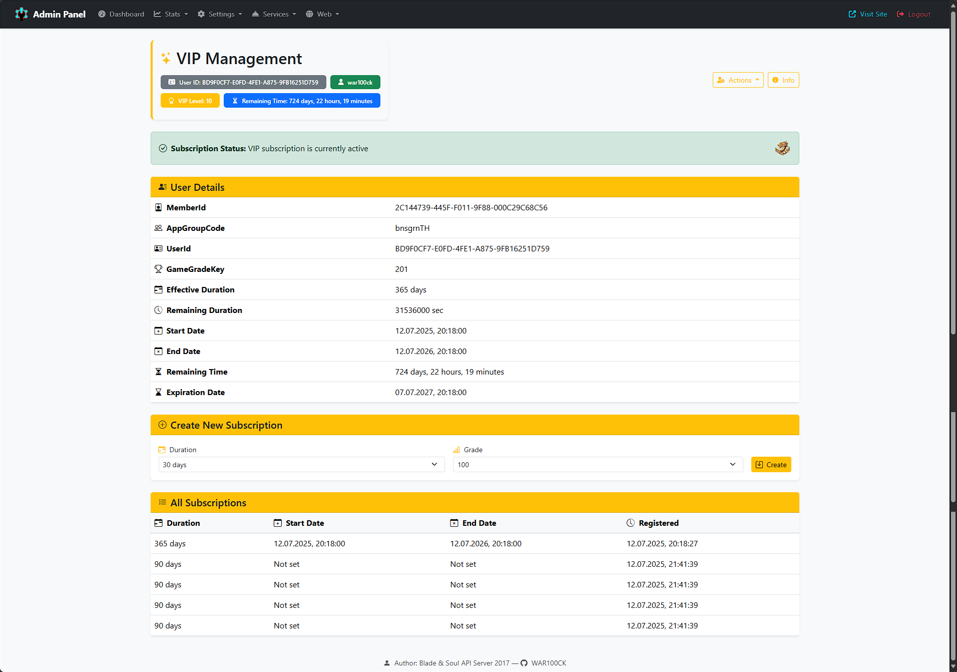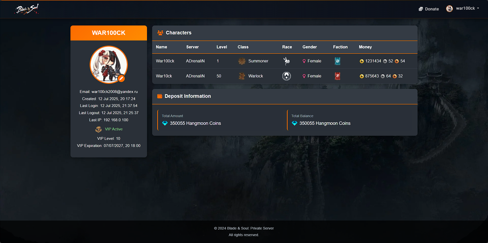 This repository contains the backend API server for the Blade & Soul private game server. The API facilitates user registration, login, profile management, virtual currency transactions, and character management. It integrates multiple databases and provides secure and scalable routes to handle user data efficiently. Currently, it is designed only for the 2020 version of the game.
