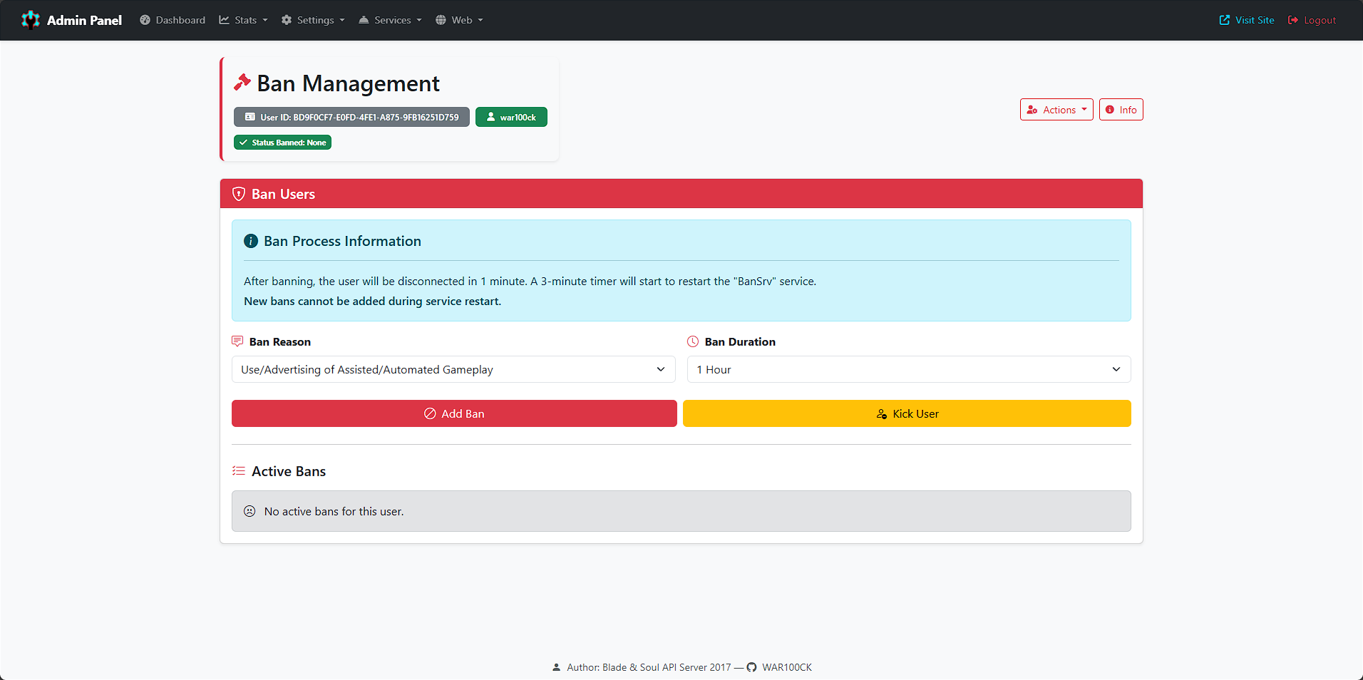 Implemented a system for temporary and permanent character bans with recorded reasons and durations.