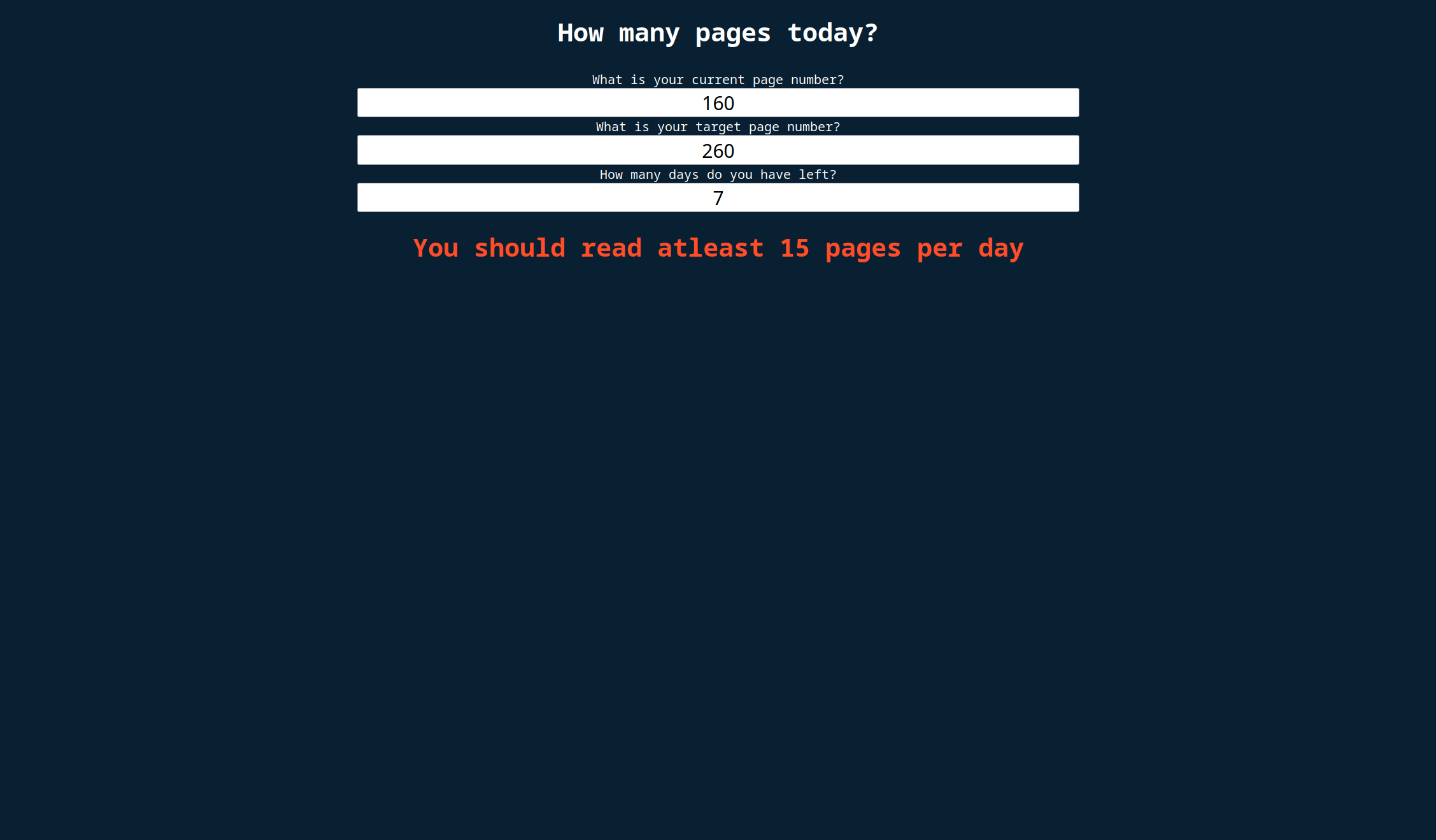 A simple github pages powered that roughly tells you how many pages you need to read in your book. I just kinda needed to make this for myself but I figured someone might thing it was useful. Overengineering courtesy of Svelte Kit.