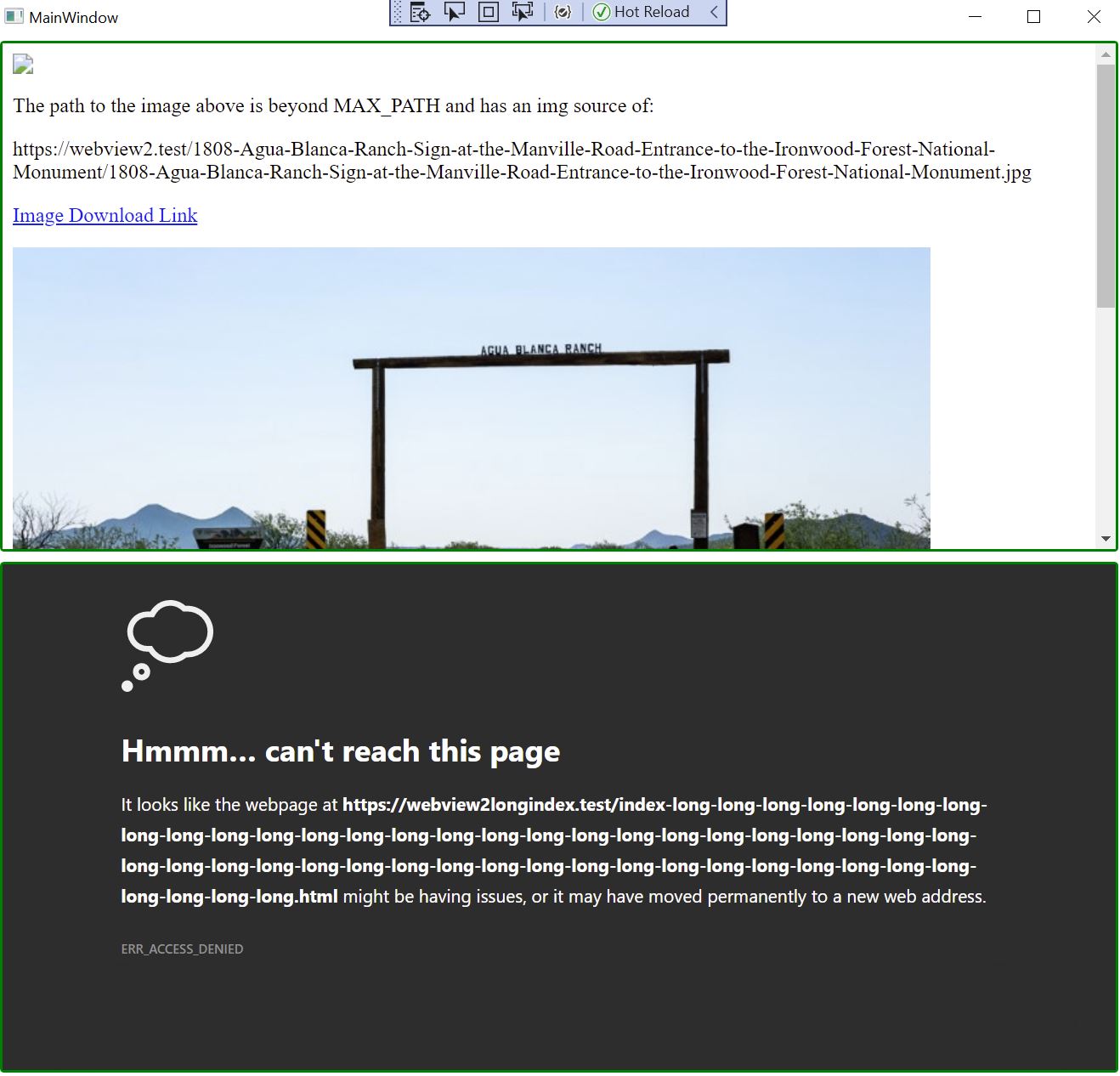 - In the top panel the source is set to an html file that is below MAX_PATH value and loads, but the top image is a link to a file beyond the MAX_PATH - the error is: Failed to load resource: net::ERR_ACCESS_DENIED