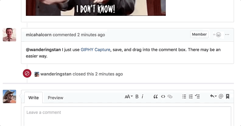 @wanderingstan I just use GIPHY Capture, save, and drag into the comment box. There may be an easier way.