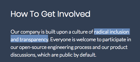 (Also something we could possibly keep an eye on in the future is maybe linking the developers to our mission statement page. We could possibly link where it says "radical inclusion and transparency" to more information in the future. An example of this is how Moz is very clear about TAGFEE on their culture page. )