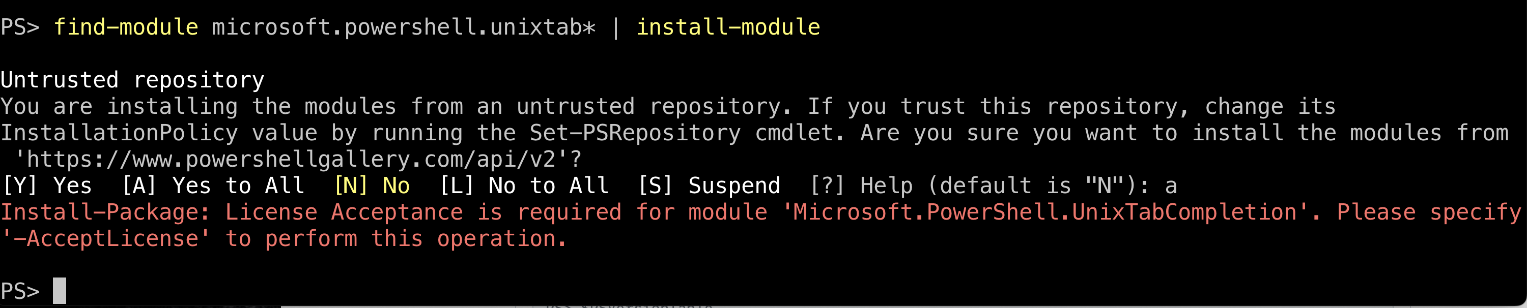 Using Find-Module to locate and install Microsoft.PowerShell.UnixTabCompletion - the module requires -AcceptLicense to complete install.