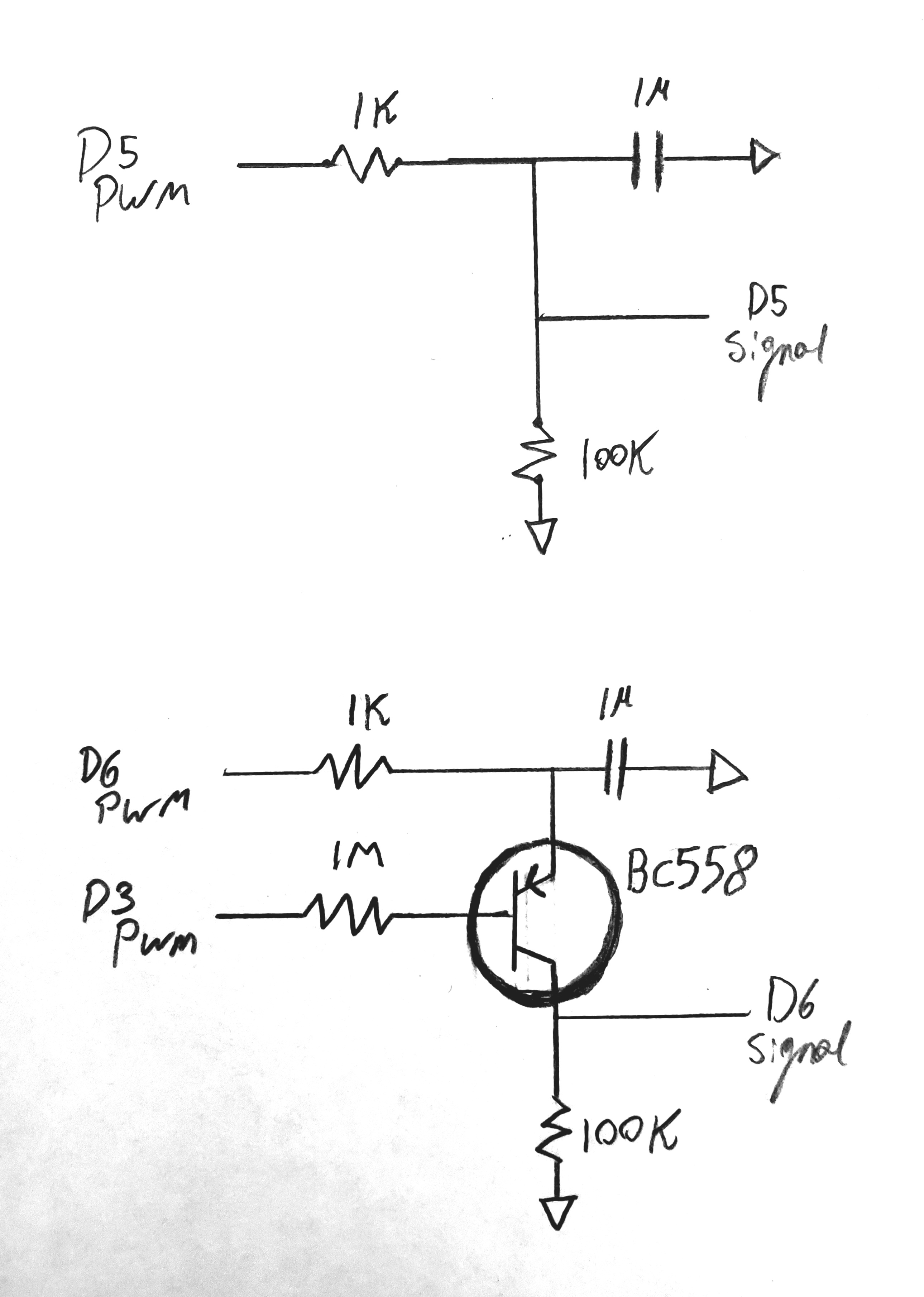 Create the DAC circuit as shown in the schematic below and hook it up to the D5 and D6 pins of the Arduino (you must use these pins for DAC), D3 must also be used for the alpha pin.
