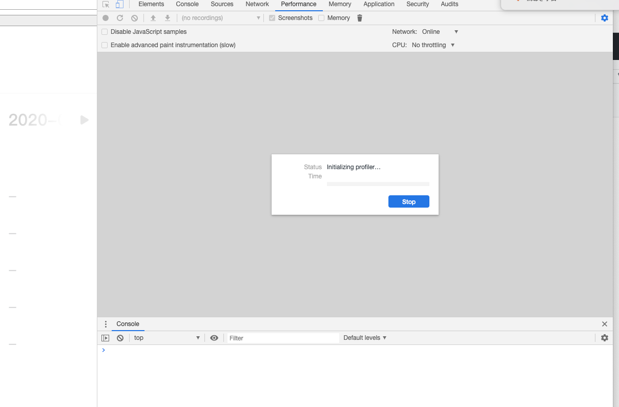 When i use 'chrome://inspect' to inspect webview in iPhone, the perfermance cannot be opend. The Chrome is blocked at initializing Profiler. Below is the Picture.