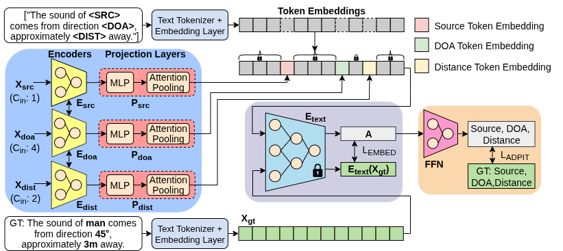 $P_\text{audio}$ ,$P_\text{doa}$ and$P_\text{dist}$ . Each projection layer consists of MLP followed by an attentive pooling layer. The dimension of the output of each projection layer is$\text{embed-dim} = 512$ .- Text encoder:
