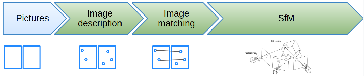 - The pipelines are created by chaining various binaries to compute image matching relation, solve the Structure from Motion problem (reconstruction, triangulation, localization) and ...