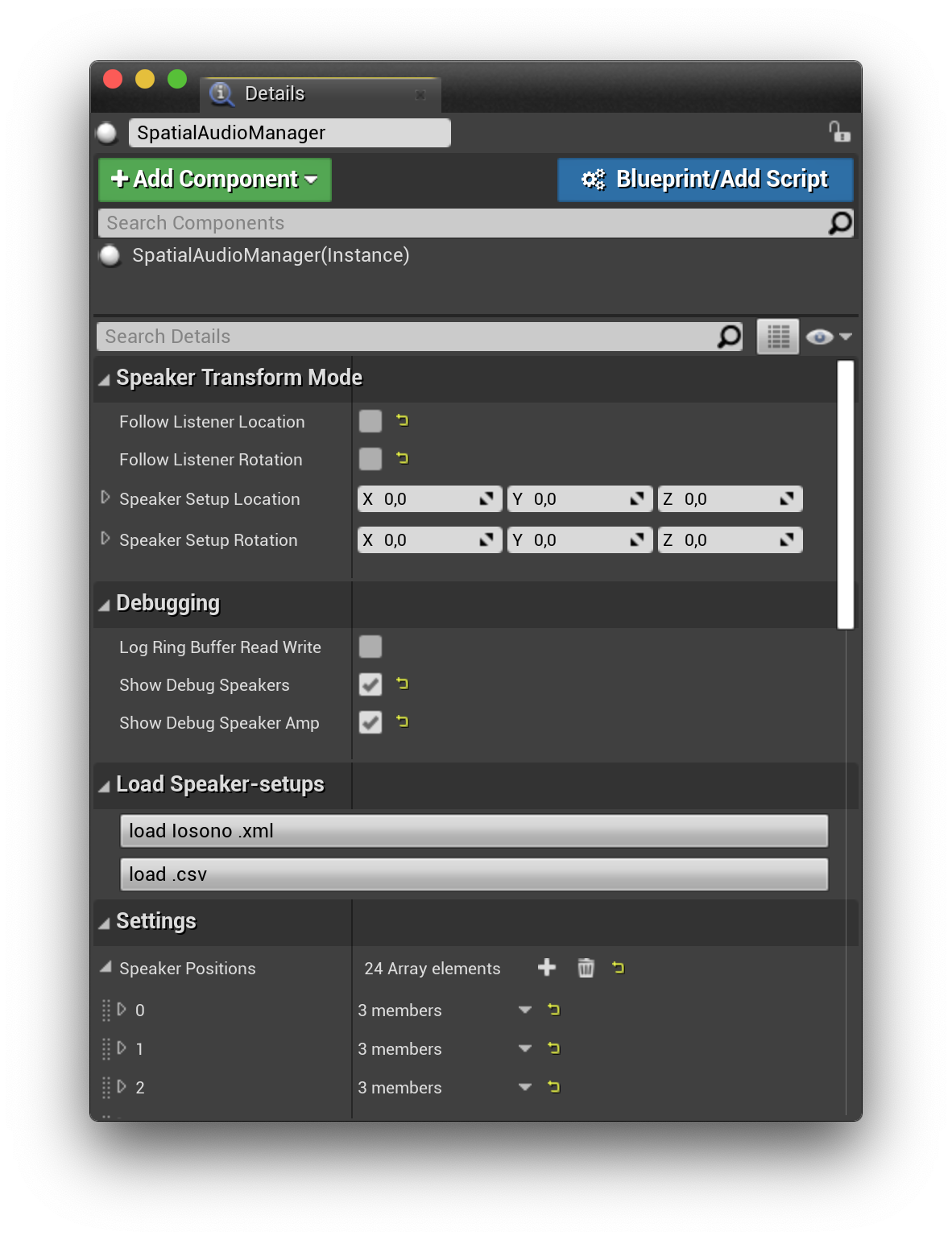 Select the SpatialAudioManager in the scene and change the settings in its details panel. Select the right Audio Output Device. As you can see, I am using Loopback Audio, because the output device needs to support as many speakers as you have set up in your speaker layout in the Speaker Positions array: