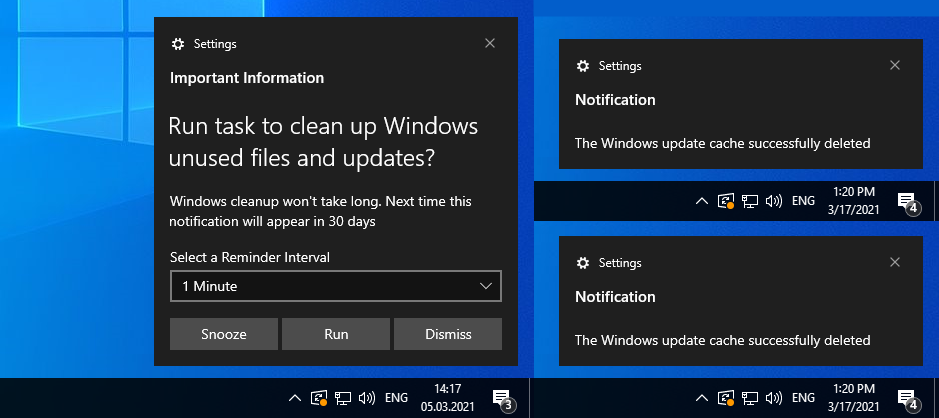 Windows CleanupandWindows Cleanup Notificationscheduled tasks for Windows cleaning up unused files and updates;- A native toast notification will be displayed where you can choose to snooze, run the cleanup task or dismiss