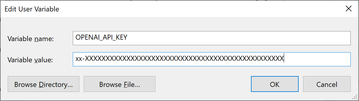 Step 4 - Type the variable name OPENAI_API_KEY in the first field and your OpenAI APIKEY in the variable value field. Then click OK.