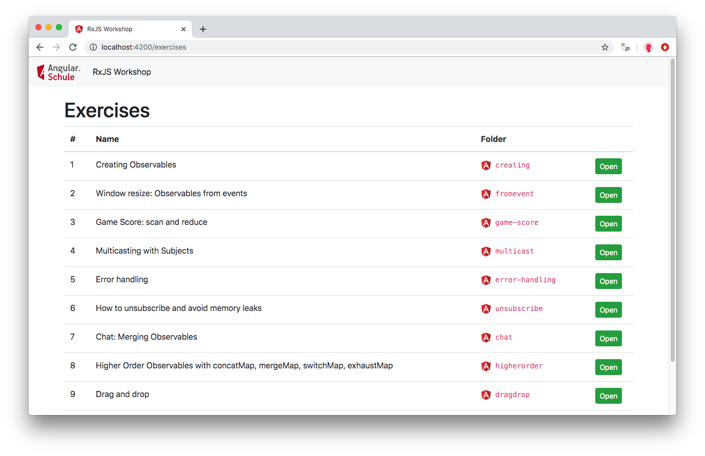 Im Browser sollte unter http://localhost:4200 nun die Übersichtsseite für die Übungen erscheinen.